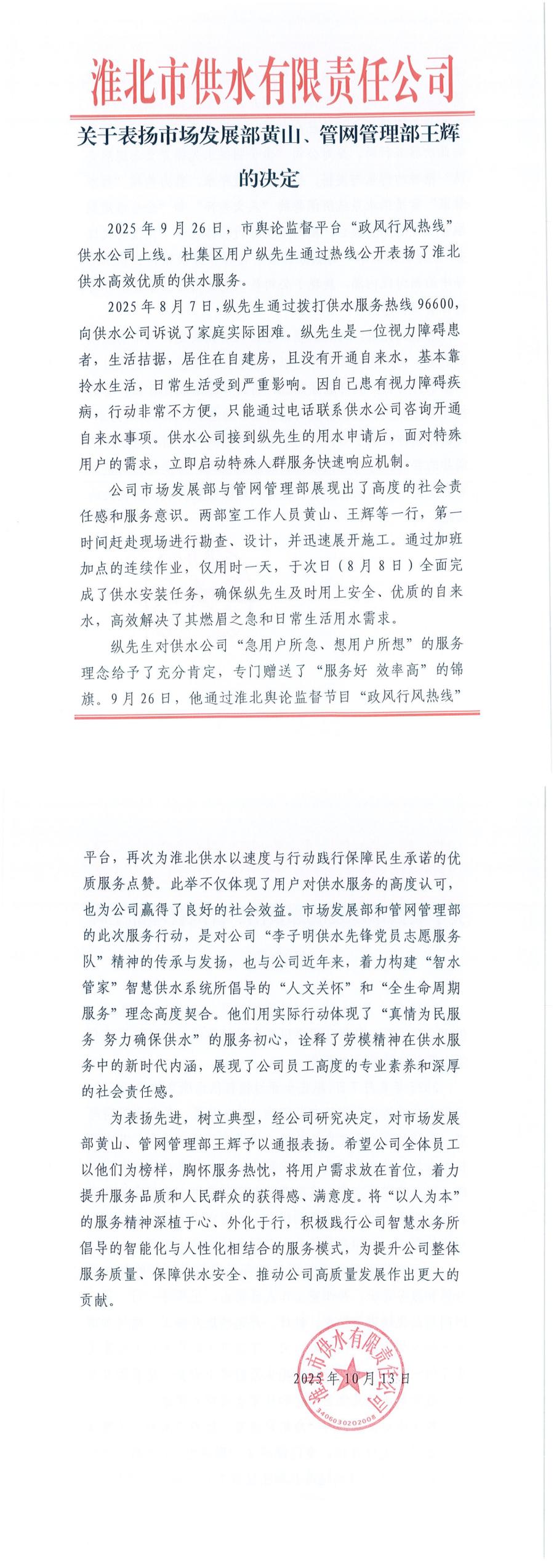 关于表扬市场发展部黄山、管网管理部王辉的决定