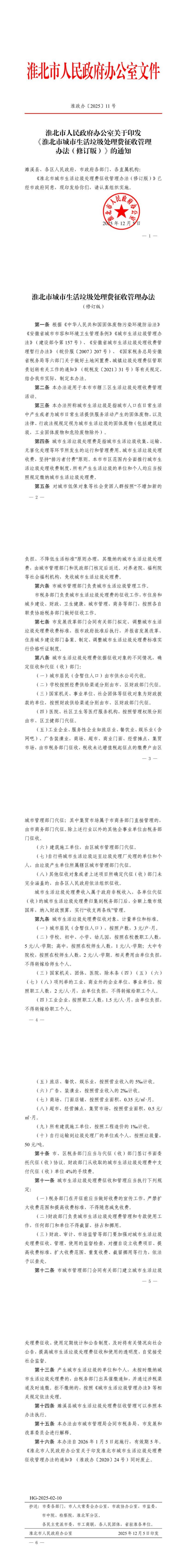关于印发《淮北市城市垃圾处理费征收管理办法(修订版)》的通知(淮政办[2025]11号